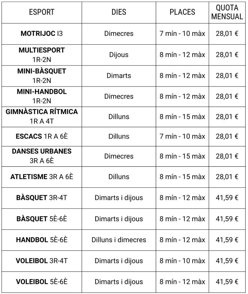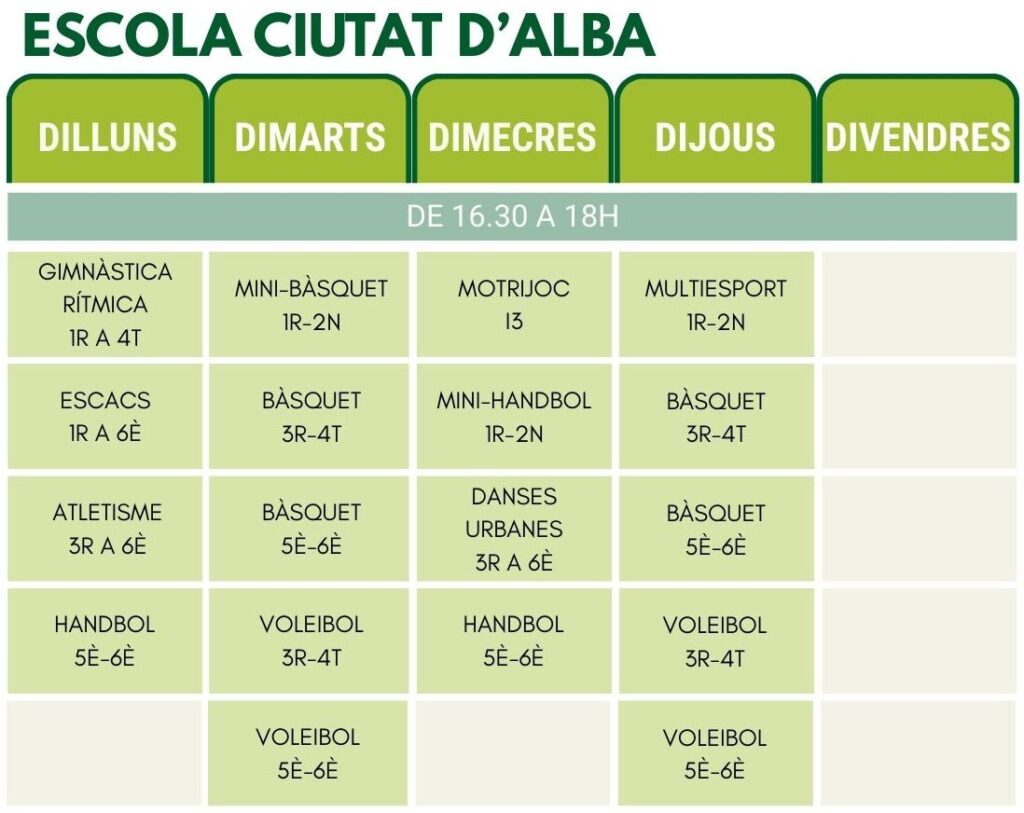 Activitats Curs 2025/2026 Centres oberts turo de can mates ferran i clua joan maragall pi d’en xandri pins del valles catalunya collserola la floresta l’olivera ciutat d’alba gerbert d’orlhac la mirada ESCOLA CIUTAT D’ALBA C/ Pere Ferrer, 5 – 08195 Sant Cugat del Vallès. Tel. 935 764 033web escola: https://agora.xtec.cat/escola-ciutat-alba/Extraescolars: omet.ciutatdalba@fundesplai.orgTf. extraescolars: 608 02 23 23 **La quota de setembre correspon a la part proporcional de 16 dies On estem Ptge. Baró de Coubertin, 508172 – Sant Cugat V. Horari DLL a DV: de 9 a 13 h i de 16 a 19 h ESTIU. Del 25 de juny al 7 de setembre, de DLL a DV: de 9 a 13 h i de 16 a 18 h. Agost tancat. Contacte Tf : 93 565 70 99Correu electrònic: omet@santcugat.cat segueix-nos FollowFollowFollowFollow