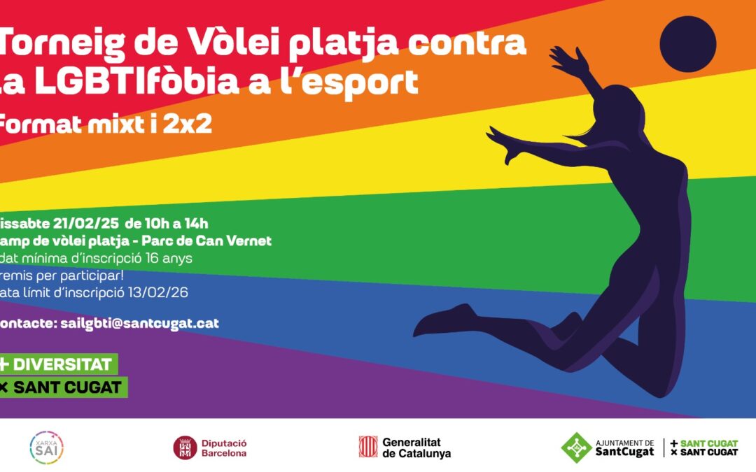 El pròxim 19 de febrer es commemora el Dia Internacional contra l’LGBTI-fòbia a l’Esport. Amb motiu d’aquesta celebració reivindicativa i de sensibilització, el Servei d’Atenció Integral LGBTI+ (servei d’atenció a la diversitat sexual i de gènere) de l’Ajuntament de Sant Cugat organitza un torneig Vòlei platja el dissabte 21 de febrer..
